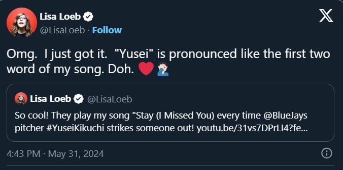 1:15 - Angels (Y. Kikuchi) at Cardinals (S. Gray) - 55 - Are the Angels playing “Stay” by Lisa Loeb after every Kikuchi strikeout, in keeping with one of MLB’s best recent traditions?